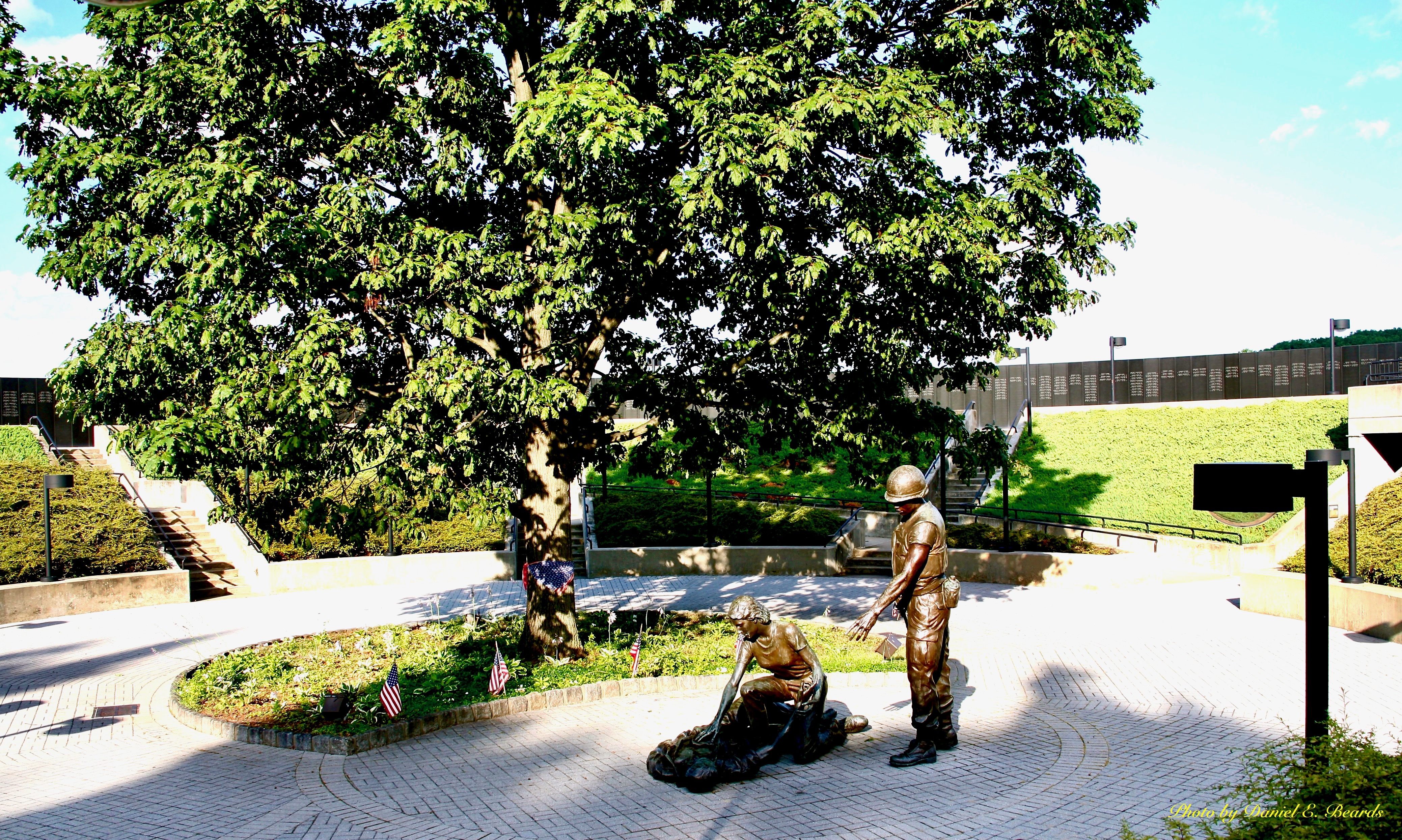 The tree provides shade for three statues, one of a dying soldier, one of a nurse tending to his wounds, and one soldier standing at their sides. They represent those who died, the women in the war, and those who came back safely, respectively. They also represent multiple nationalities as the fallen soldier is white, the standing soldier is African American, and the nurse is Latino.