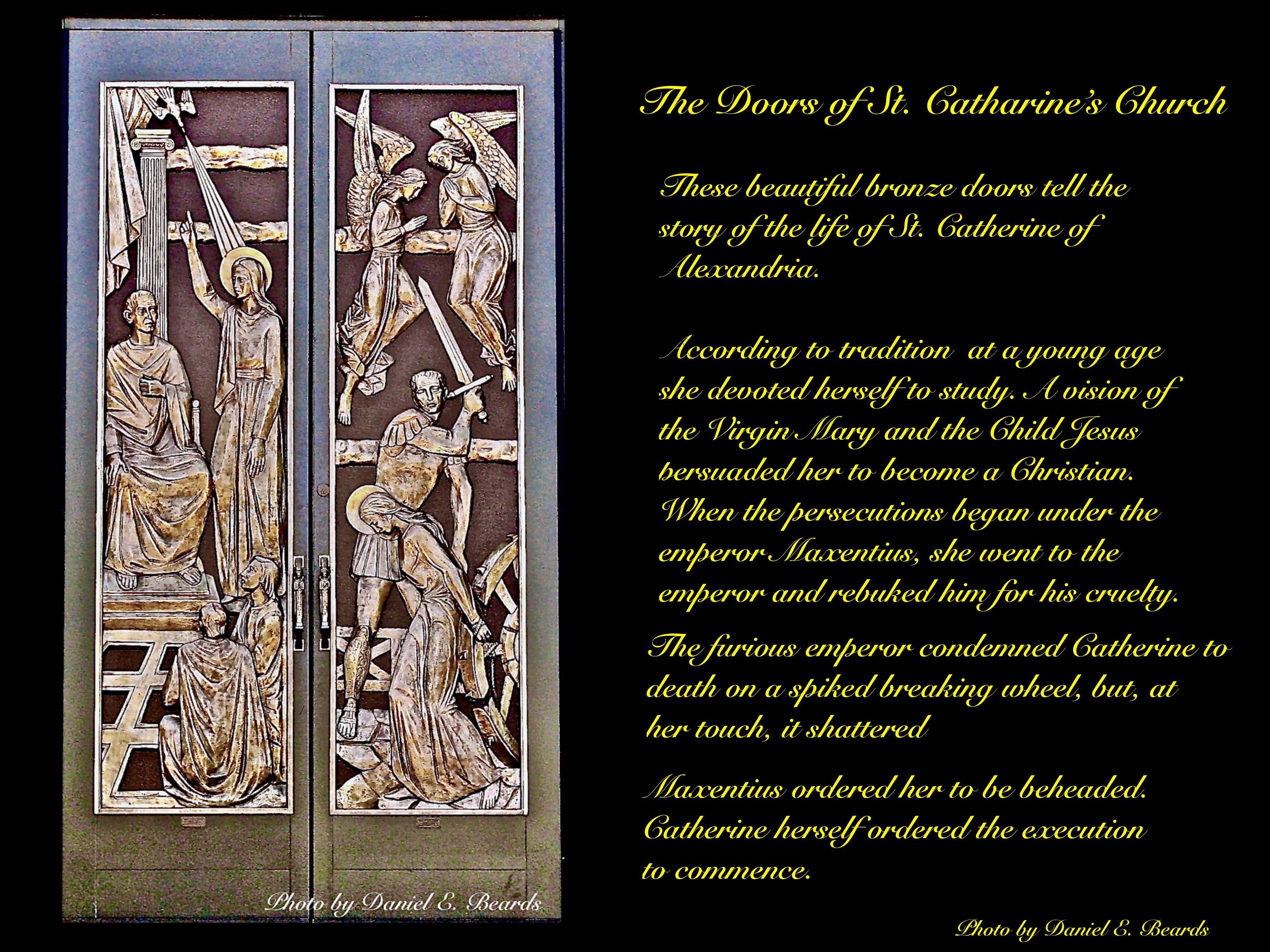 These doors show Catharine speaking to the Emperor Maxentius and her death by being beheaded.
