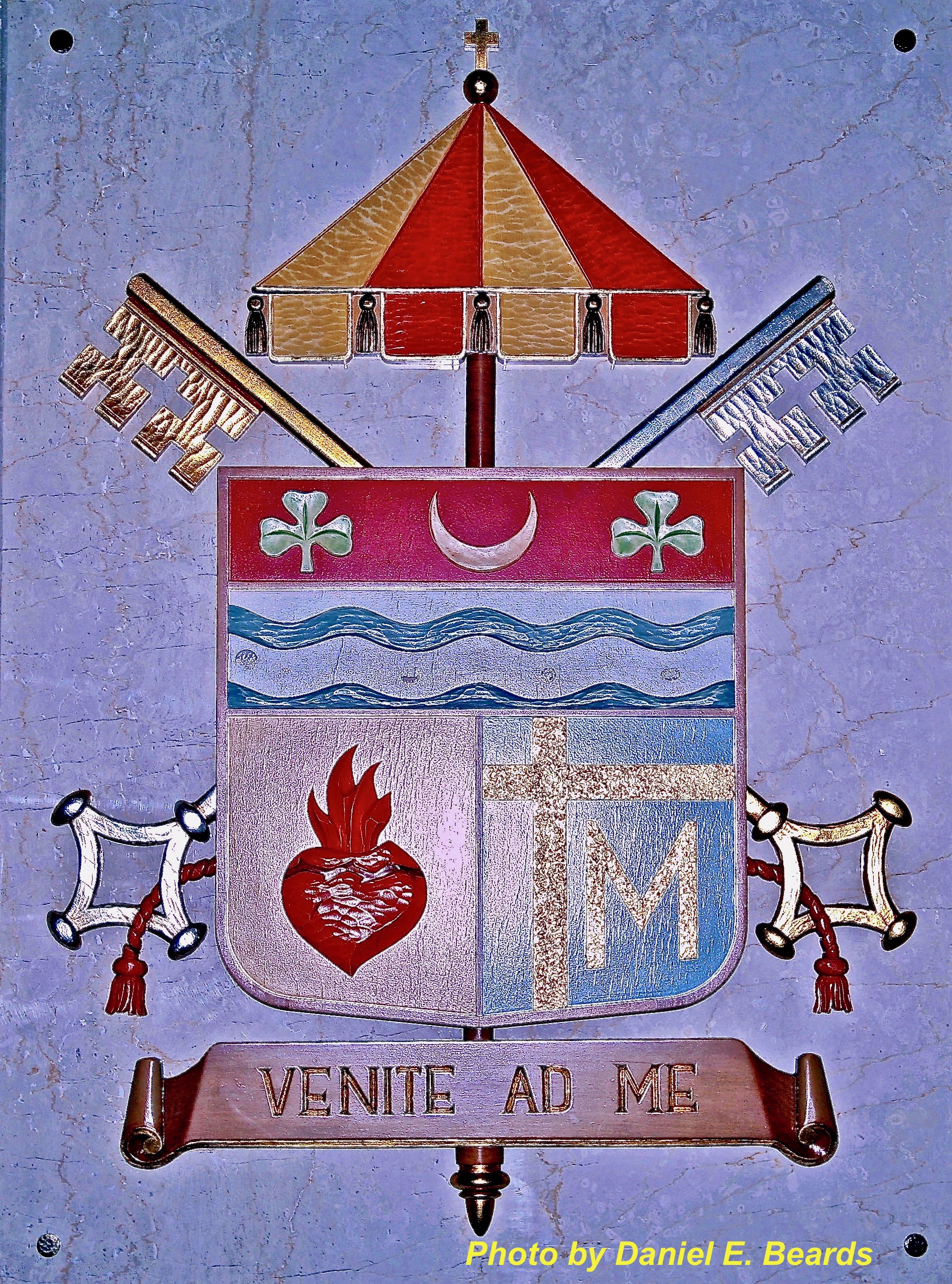 The shield mounted on the west wall is the coat of arms of the Cathedral Basilica. The upper section taken from the Archdiocesan coat of arms represents the Archdiocese of Newark. The lower section (Sacred Heart) denotes the Cathedral (viewer's left) and Pope John Paul II's coat of arms (viewer's right). Behind are symbols of a basilica, linking it to the Pope: keys ("To you I will give the keys of the kingdom") and a traditional processional canopy. "Venite ad me"