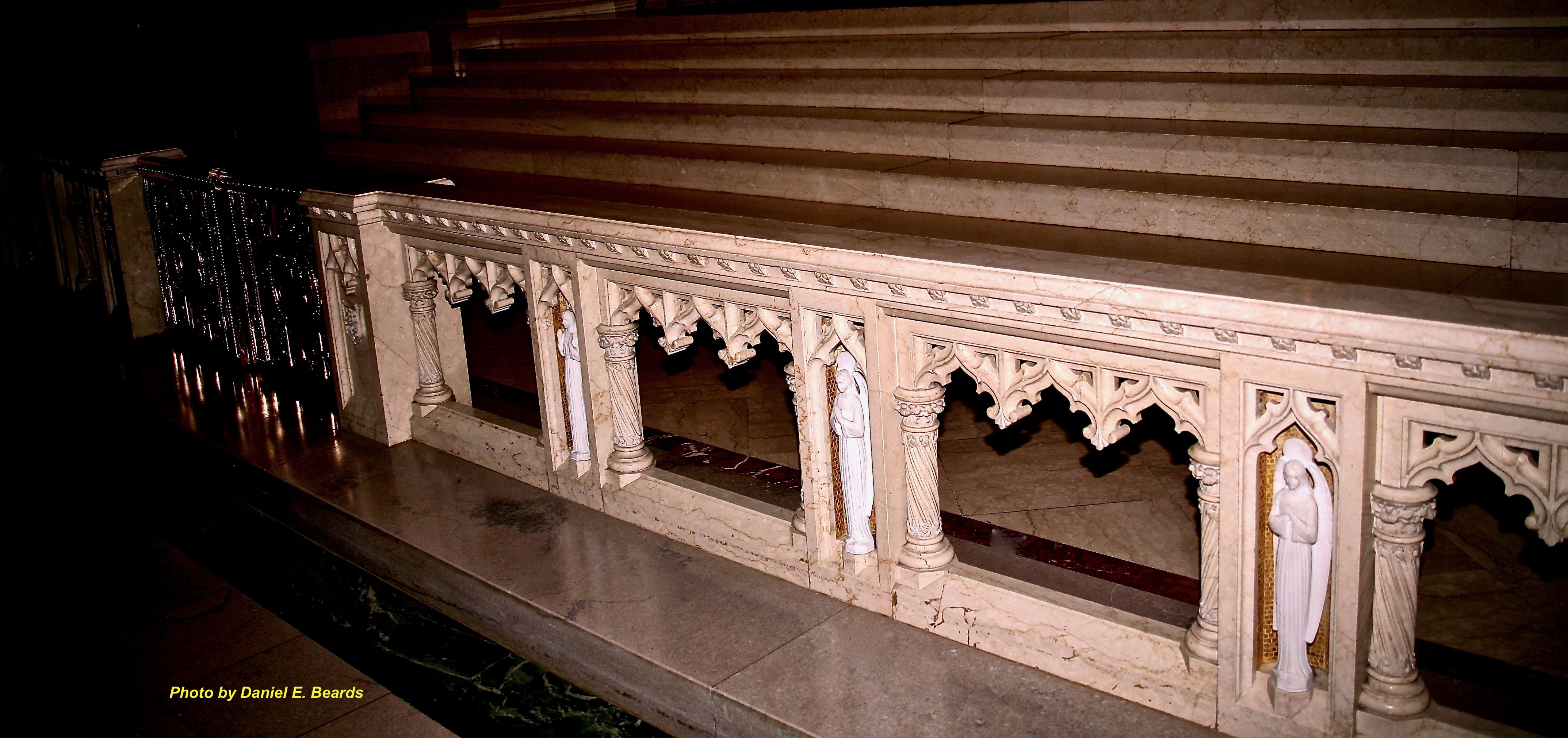 This Communion rail is designed with niches containing statuettes of angels.