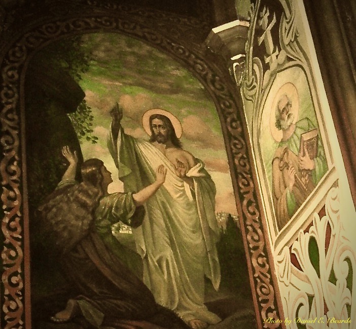 This icon depicts Mary Magdalene with Jesus on Easter Sunday morning. The icon is located in Saints Peter and Paul Orthodox Cathedral in Jersey City.