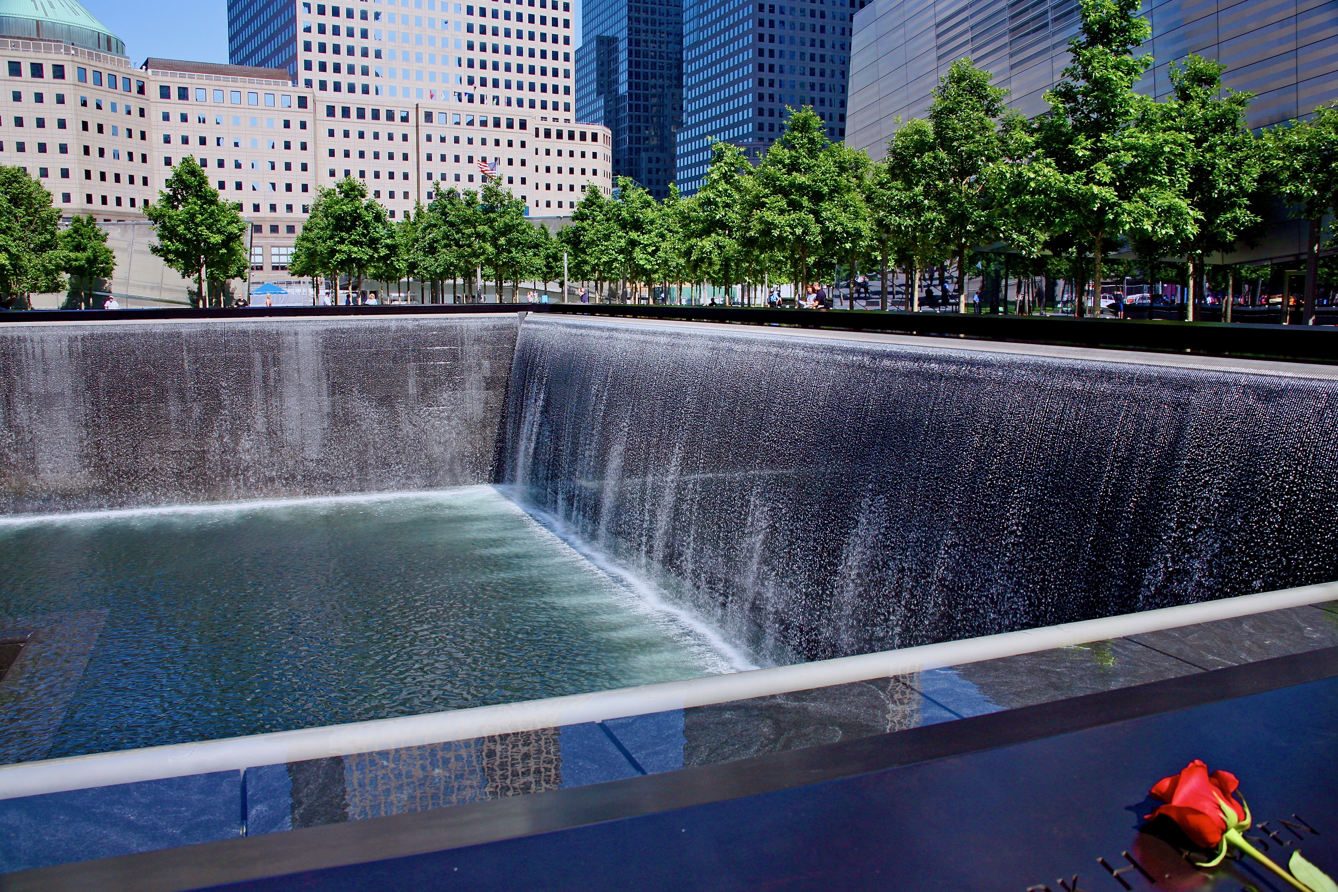 At nearly an acre in size, the North Pool is located in the footprint of the former North Tower. The pool contains the largest manmade waterfall in North America, each descending 30 feet into a square basin. From there, the water in each pool drops another 20 feet and disappears into a smaller, central void.